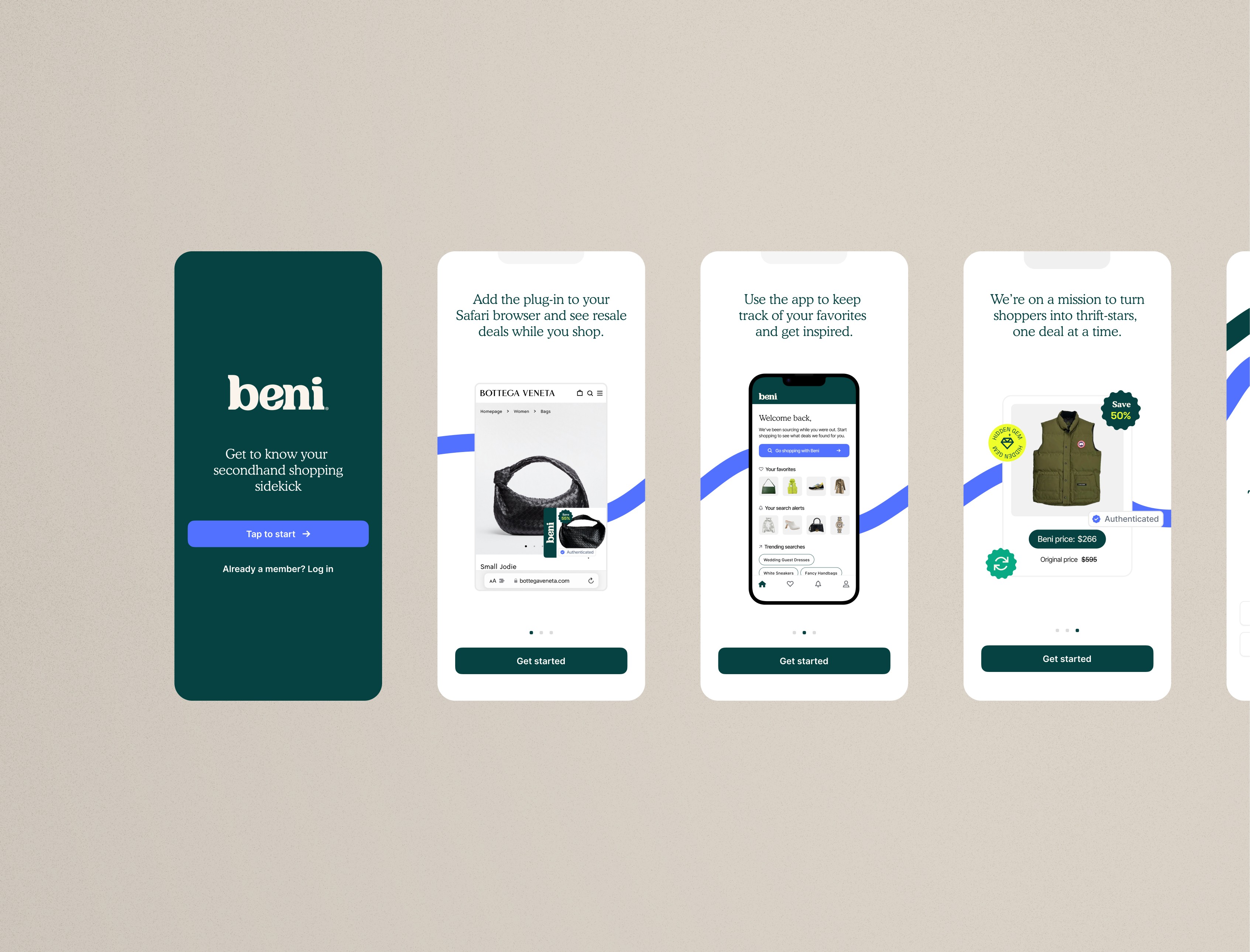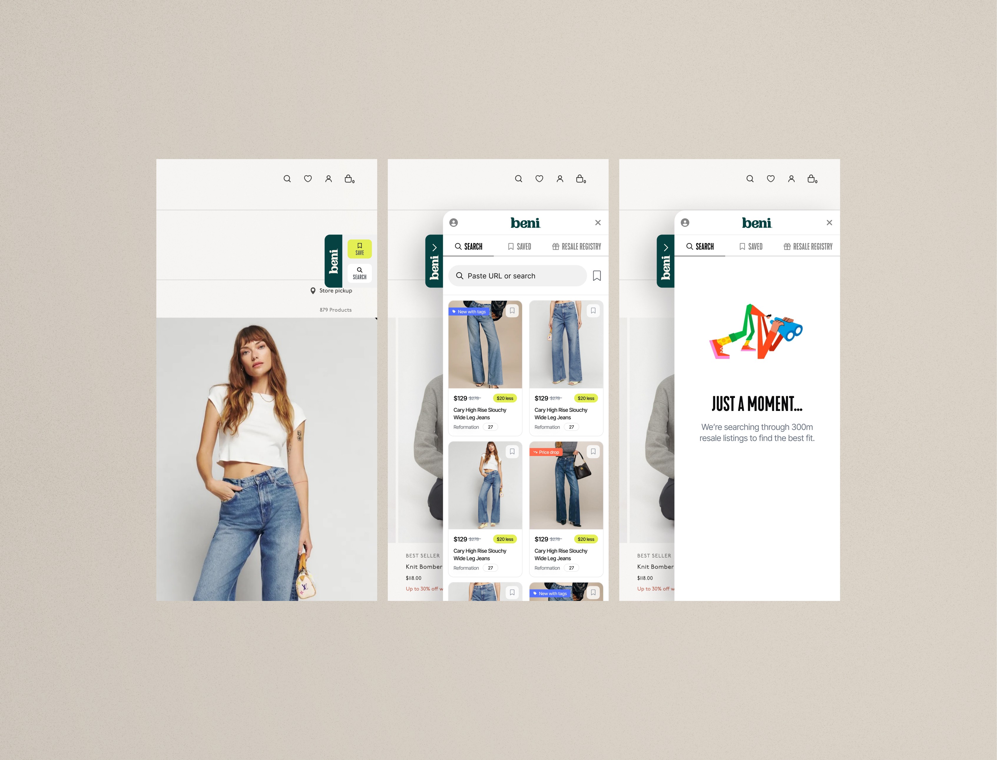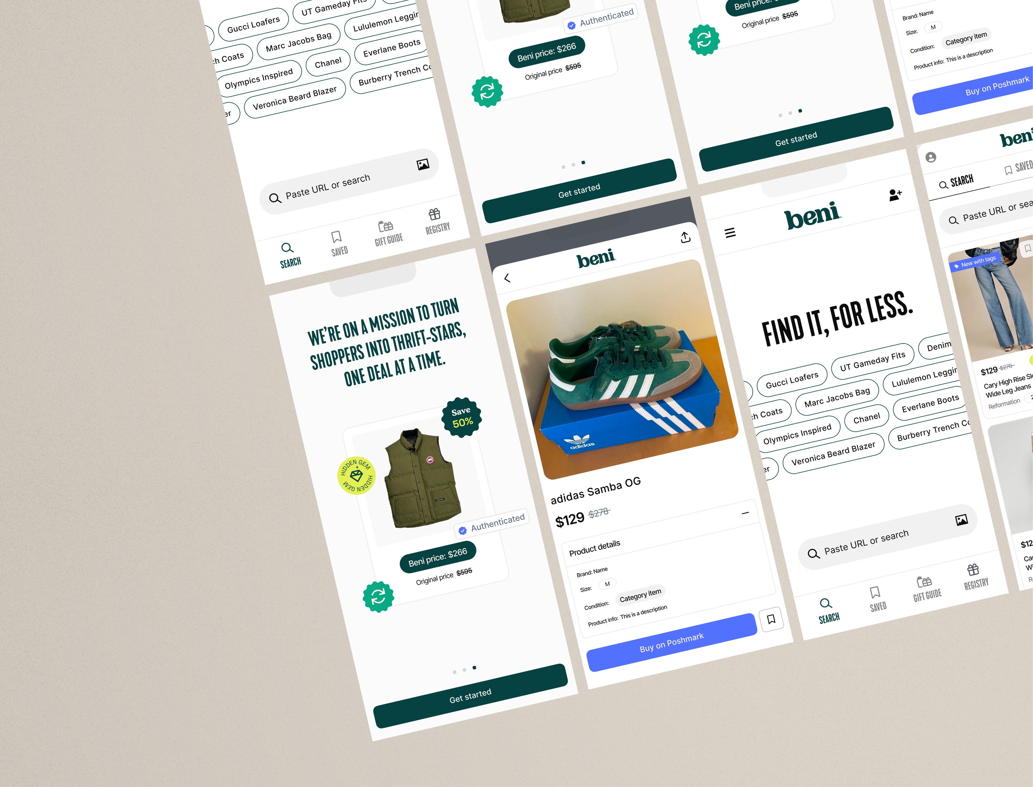 Beni, an app aggregating deals from over 40 secondhand sites, presented a unique opportunity to enhance the resale shopping experience. While Beni successfully connected users with pre-loved treasures, it faced challenges in: (1) Discoverability: The existing app interface lacked intuitive navigation and clear visual cues, making it difficult for users to easily find and browse through the vast array of deals. (2) Brand Identity: The existing brand identity felt dated and lacked the sophistication and modernity expected of a platform dedicated to curated secondhand fashion. (3) User Engagement: The app struggled to maintain user engagement, with limited personalization features and a lack of incentives for repeat use.