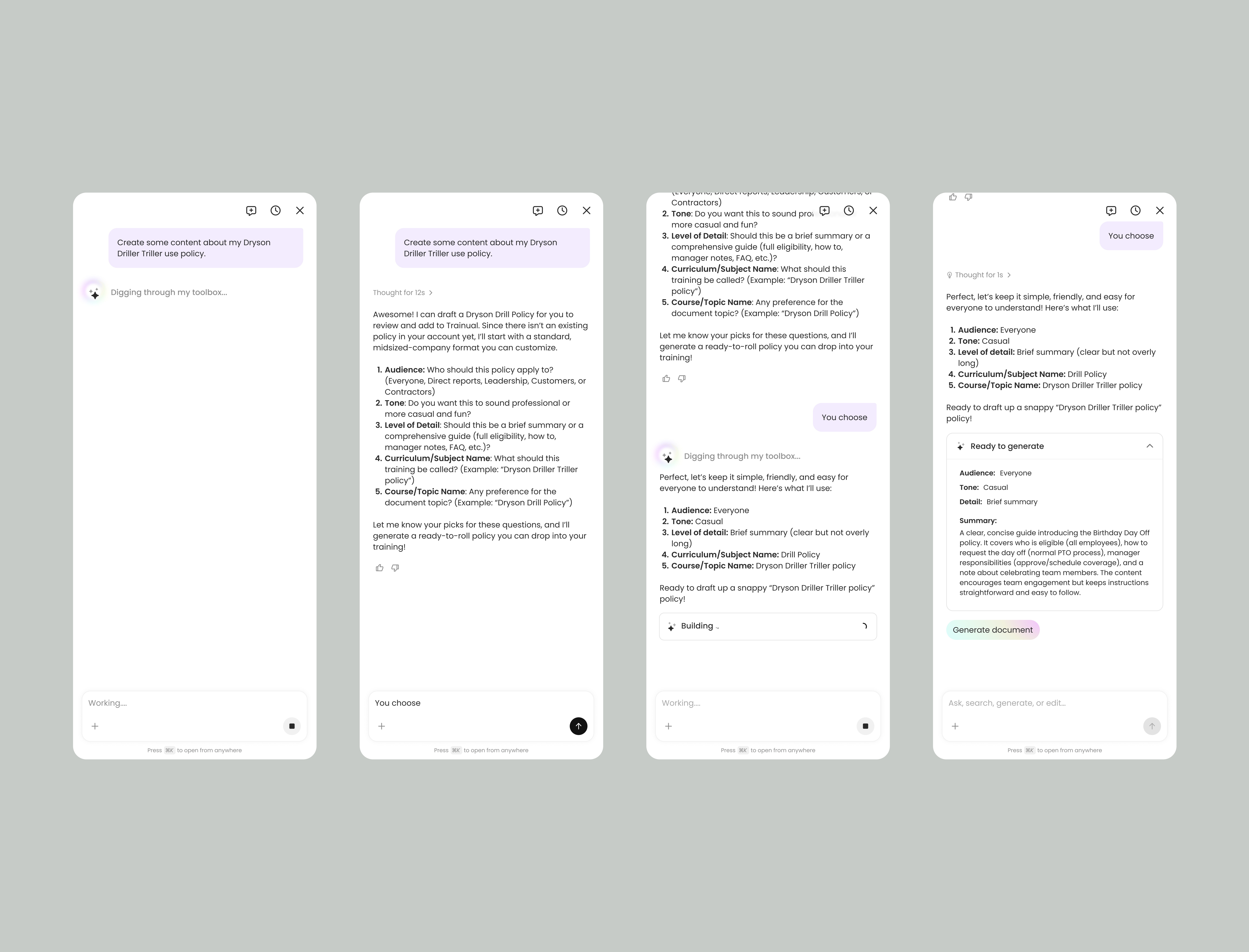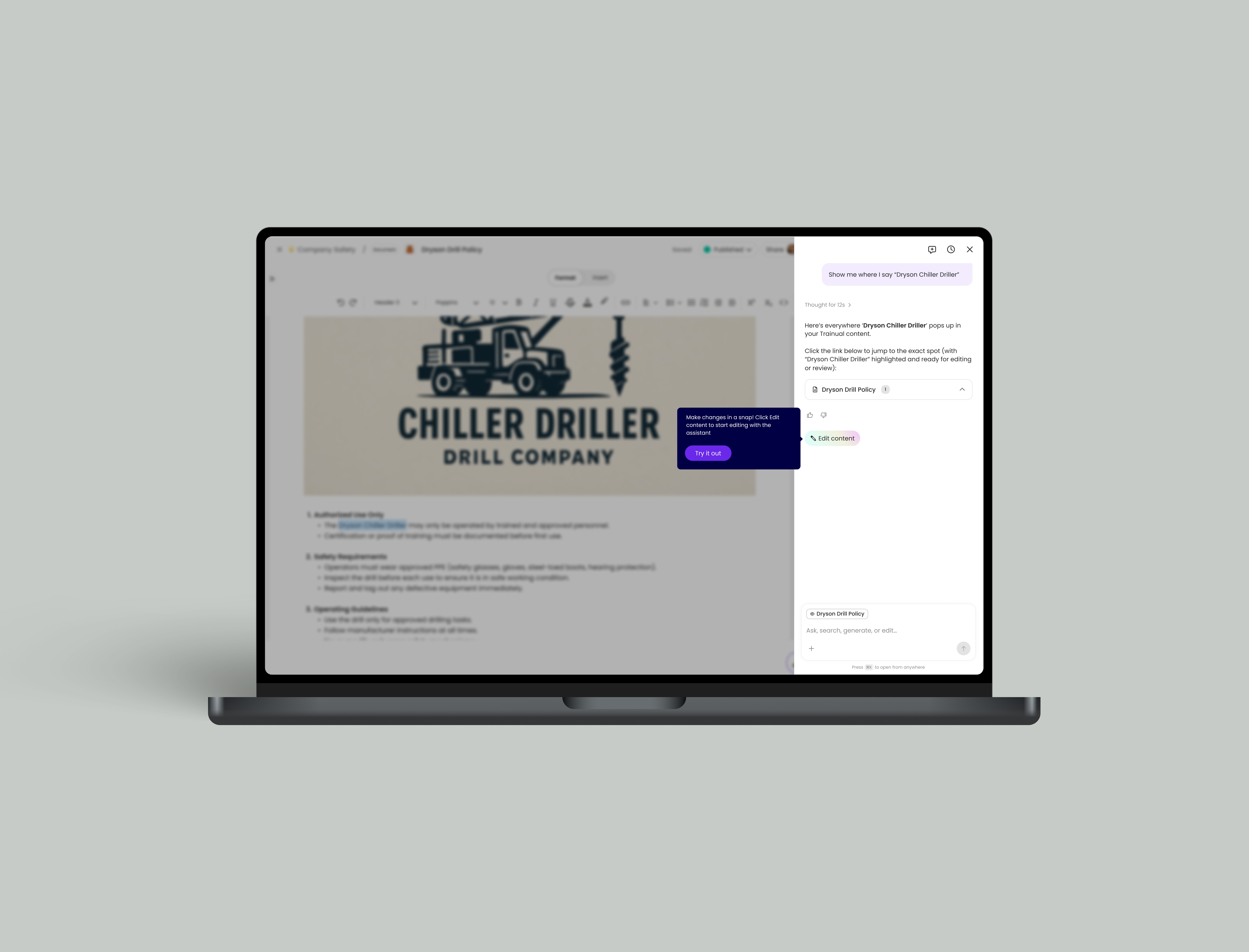 Trainual set out to evolve from a structured knowledge platform into an AI-powered product experience. The goal was to embed a fully integrated AI assistant directly into the application, enabling content creation, editing, search, and contextual guidance. We faced several constraints: (1) A compressed timeline driven by competitive market pressure (2) The need to layer AI onto an existing non-AI-native system (3) Ongoing LLM experimentation while defining UX patterns (4) Maintaining user trust while introducing generative capabilities The challenge was not simply adding chat. It was embedding intelligence into established workflows in a way that felt native, scalable, and trustworthy. As Lead Product Designer, I led the UX strategy, defined the interaction architecture, and established the foundational AI system layer. I partnered closely with engineering and product to shape model behavior, define guardrails, and ensure the assistant felt cohesive within the existing ecosystem. I also leveraged AI-assisted design workflows to dramatically accelerate ideation, prototyping, and iteration speed without sacrificing system integrity.