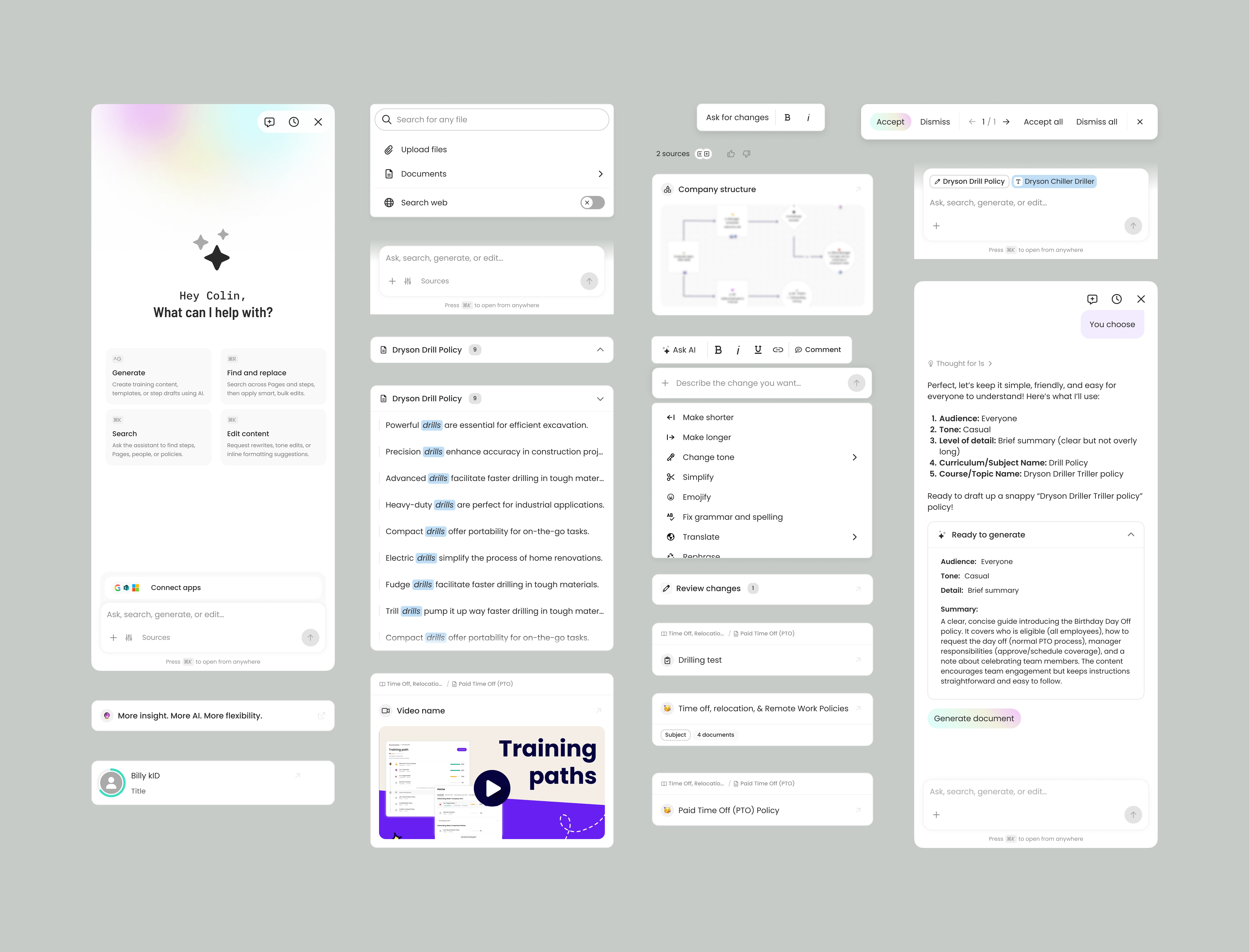 I structured the initiative around three principles: (1)Defined interaction models for AI within existing workflows (2) Built a dedicated AI component library and visual language (3) Created modular UI patterns for chat, inline editing, prompt states, and generation states (4) Designed confidence and trust indicators to support adoption